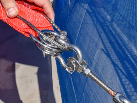 We recommend that you use a Turnbuckle and Bow Shackle at each corner for maximum flexibility during the initial installation.